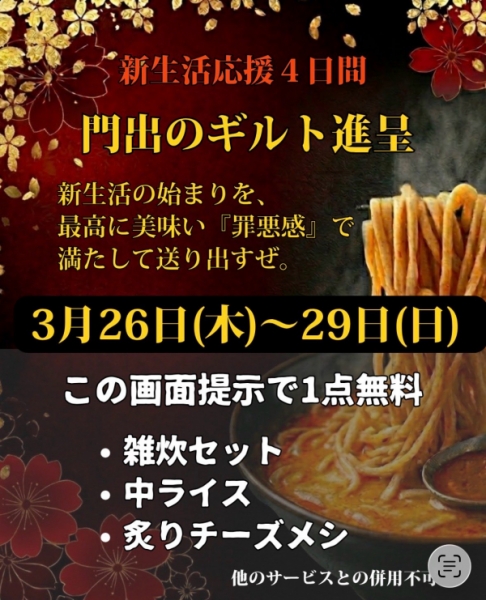 新生活応援4日間〜門出のギルト贈呈〜 2026-03-24 16:39:23 門出のギルト贈呈新生活の始まりを、最高に美味しい「罪悪感」で満たして送ります。【実施期間】3月26日(木)〜3月29日(日)【特典】下の画面提示で 1点無料雑炊セット中ライス炙りチーズメシ※他サービスとの併用不可